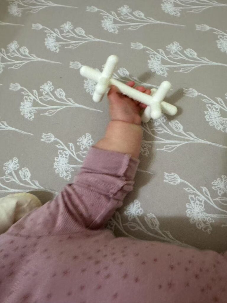 推荐买白色的,同款裸色的是天然橡胶的不建议买(过敏风险,具体原因我在小红书发过这篇帖子)。这个我自己还没买,我也是加好了购物车打算买的。医用级别硅胶材质,BPA free,没有用合成染料,并且根据小伙伴说,因为这个形状,不容易引起 小宝宝gag。总的来说设计很优秀,也非常非常安全。我想多买几个牙胶因为每个不同形状可以锻炼不同抓握,并且刺激到不同部位的牙齿嘛。感谢小伙伴提供照片!